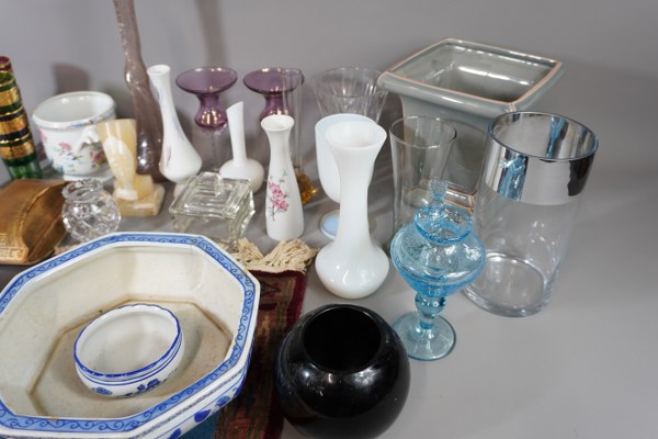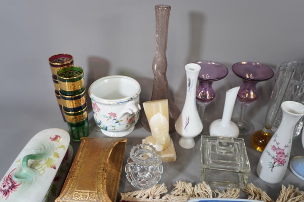 Lot de verreries comprenant des vases, verres, bougeoirs... Buvard, poulie en porcelaine, buste Égyptien...