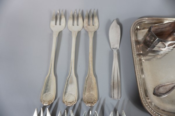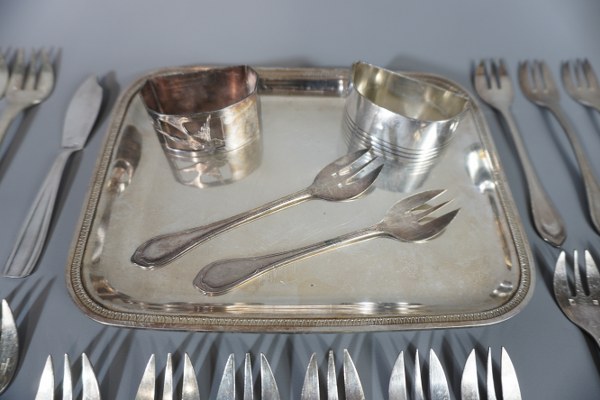 Lot de métal argenté comprenant un plateau, ronds de serviette et fourchettes dont christofle.