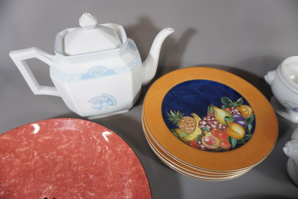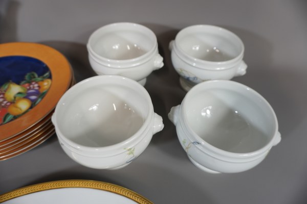 2 Grandes assiettes en porcelaine blanc et or. 6 Assiettes manufacture la reine Antella, 4 bols et 1 théière.