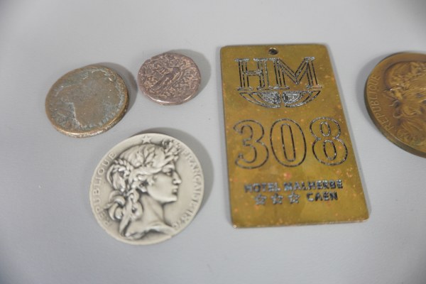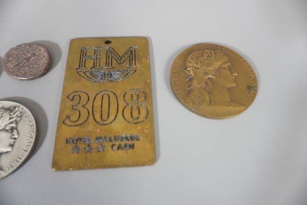 Plaque de L'Hôtel Malherbe n°308, 2 médailles de table et 2 pièces.