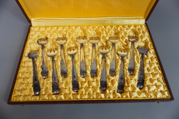 12 Fourchettes à huitre en métal argenté dans leur écrin.