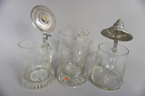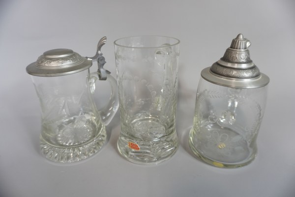 3 Choppes en verres dont 2 avec couvercles en étain.