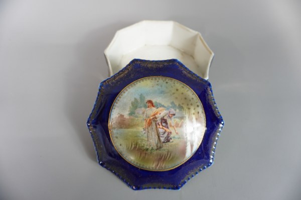 Bonbonnière en porcelaine à décor de fermières. 8x17cm.