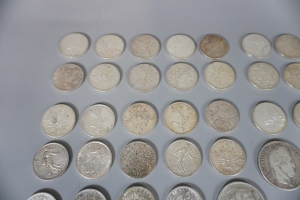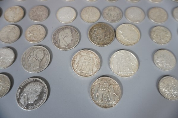 Lot de pièces en argent dont : - 5 francs semeuse 1964 x 10, 1960 x25, 1962 x14, 1963 x 15, 1961 x 4, 1964 x 2, 1966 x 1 et 1968 x 1 - 10 francs Hercule x 3 (1965, 65,67) - 5 francs Hercule 1875 - 20 francs Turin 1938 - 5 francs Louis Philippe 1832 x 2 - 5 francs belges Leopold 1er 1851 Poids : 1060 gr.