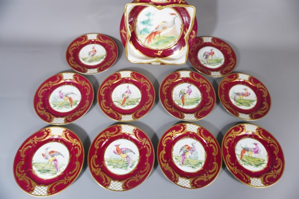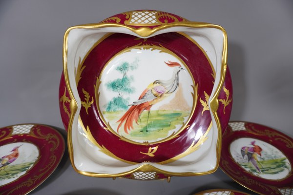 Lot de 10 assiettes et 1 vide poche en porcelaine à décor de volatile sur fond bordeaux.