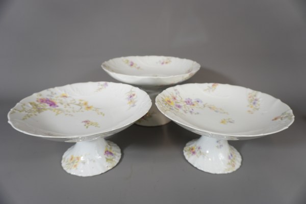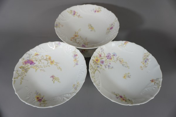 Partie de service de vaisselles MTR en porcelaine à décor floral "12 assiettes plates, 12 assiettes à dessert, 1 plat de 40cm, 1 plat 35cm, 1 plat diamètre 31cm, 2 plats diamètre 28cm, 1 plat creux diamètre 30cm, 1 légumier 25cm, 1 saucière avec couvercle, 1 soupière diamètre 23cm et 21cm, 2 coupes sur pied". Accidents.