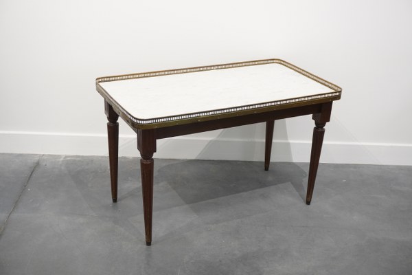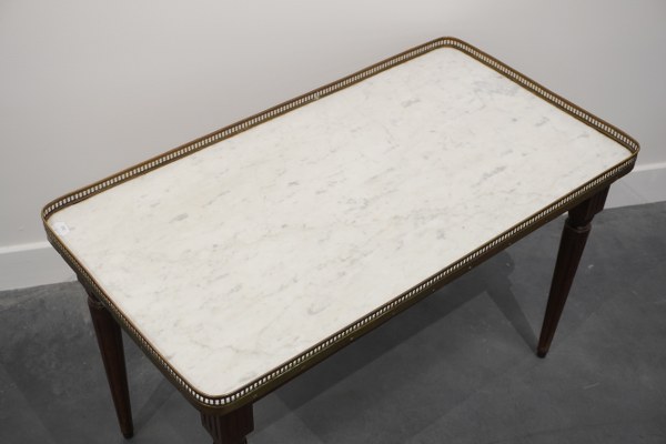 Table basse dessus de marbre blanc avec galerie en laiton. Hauteur: 53cm. 86x46cm.