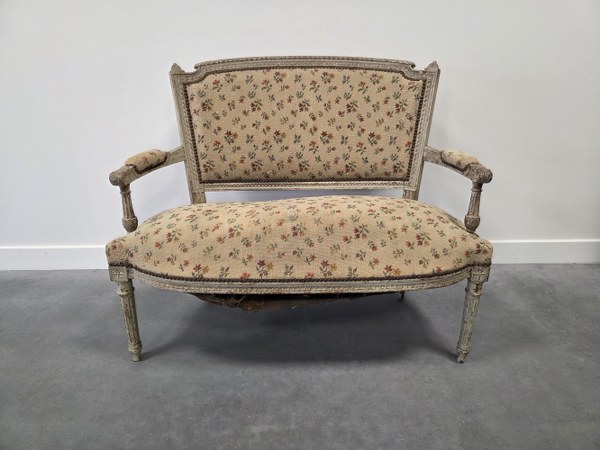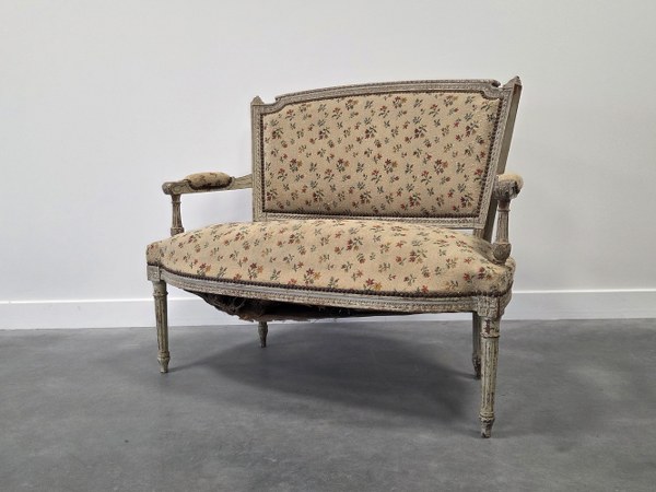 Canapé en bois mouluré blanc, garniture de tissu à fleurs rouges et jaunes. Style Louis XVI. Epoque XIXème siècle. 84,5 x 103 x 47 cm. Assise accidentée, manques.