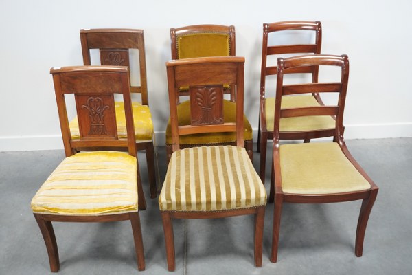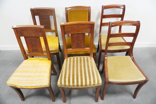 Lot de 6 chaises dont 1 paire et 1 trio. Assise à revoir.