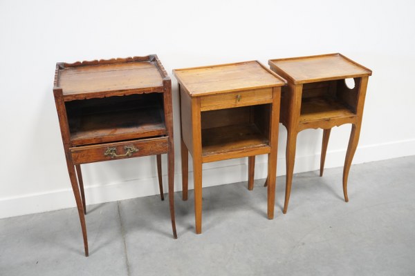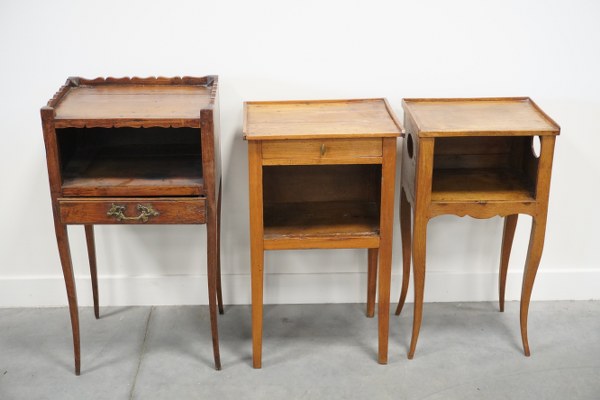 Lot de 3 chevets en bois fruitier dont 2 avec tiroirs. Hauteur: 77cm.