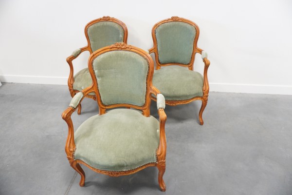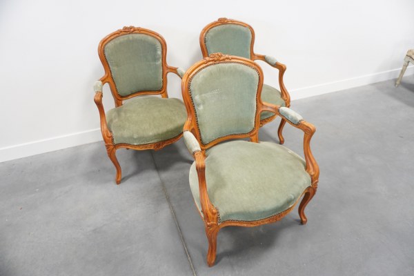 3 Fauteuils de style Louis XV avec garniture en velours capitonné. Hauteur: 85cm. Restauration.