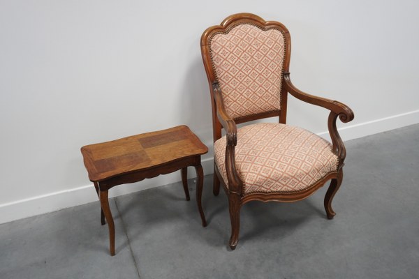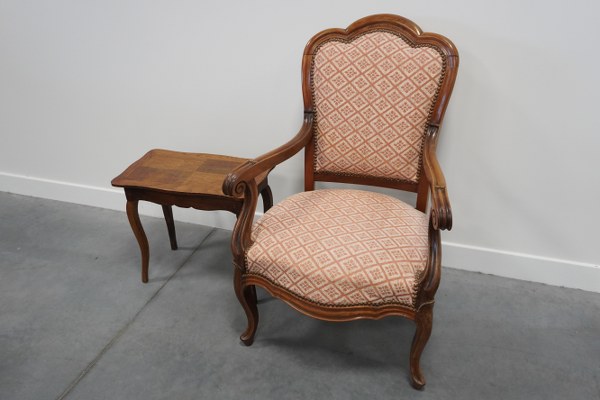 Fauteuil de type voltaire à pieds courbés avec garniture capitonnée. On y joint une petite table basse.