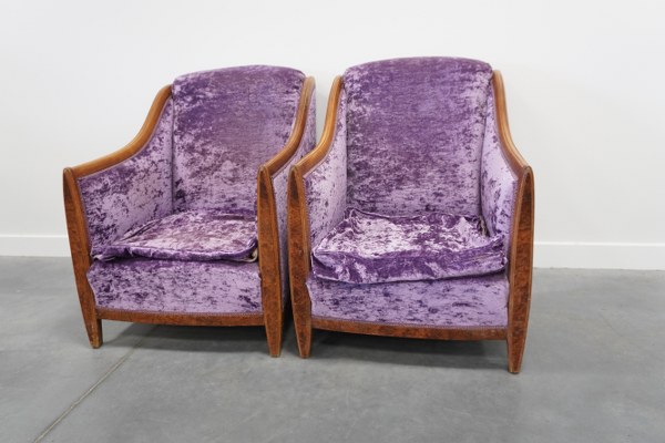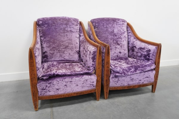 Paire de bergères en velours violet (bon état). Manque les coussins d'assise. Hauteur: 86cm.