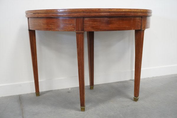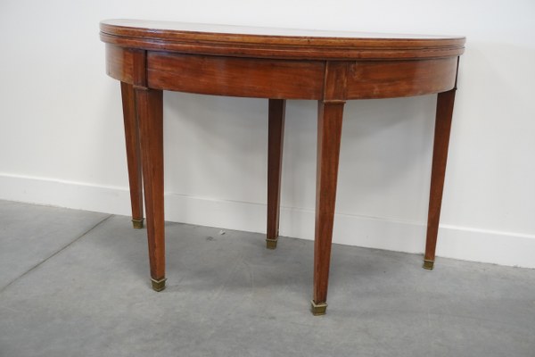 Table à jeux demi-lune à abattant. Pied central arrière cassé. Hauteur: 75cm.