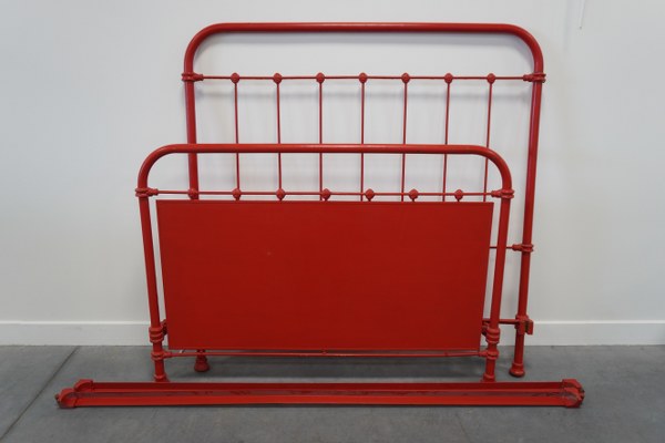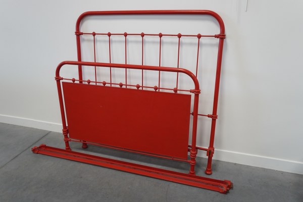 Lit 1 personne en fer forgé peint en rouge.