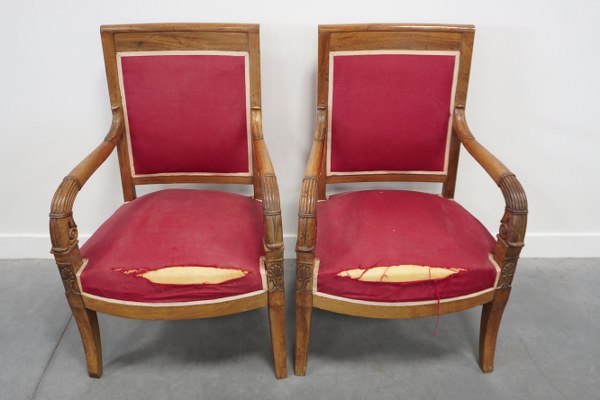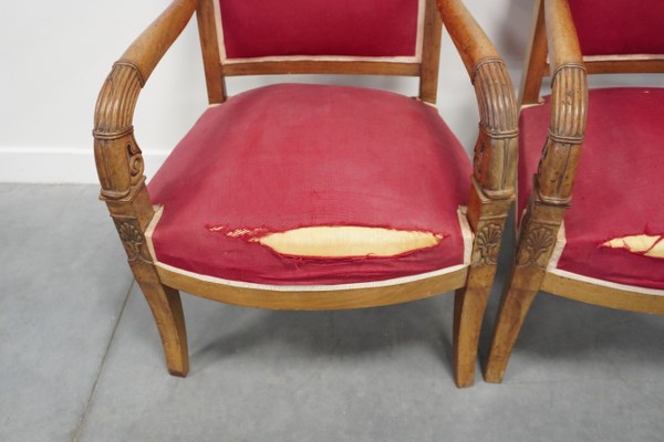 Paire de fauteuils directoire en acajou, l'un insolé. Tissus de l'assise déchiré. Hauteur: 92cm.