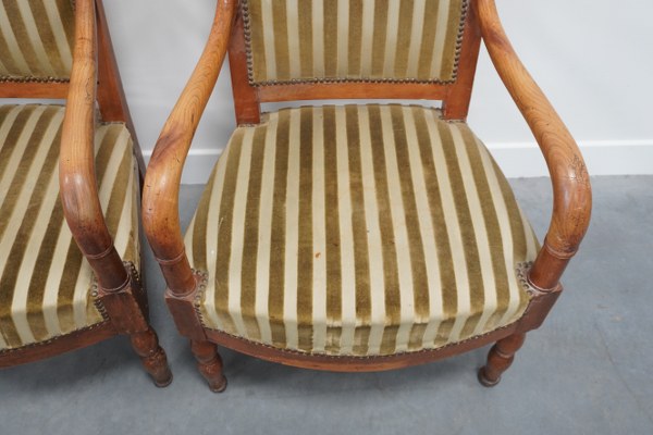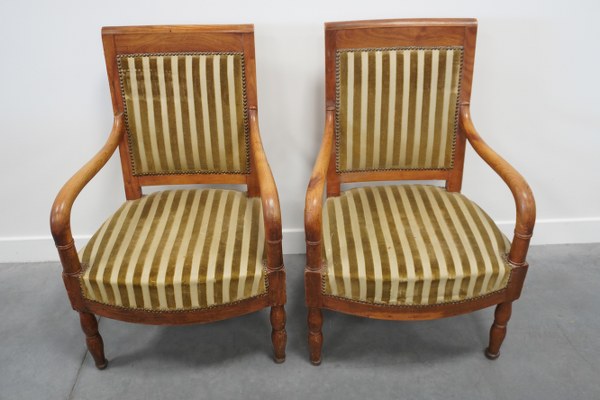 Paire de fauteuils en bois fruitier avec garniture en velours rayé et capitonné. Trou de ver. Hauteur: 89cm.