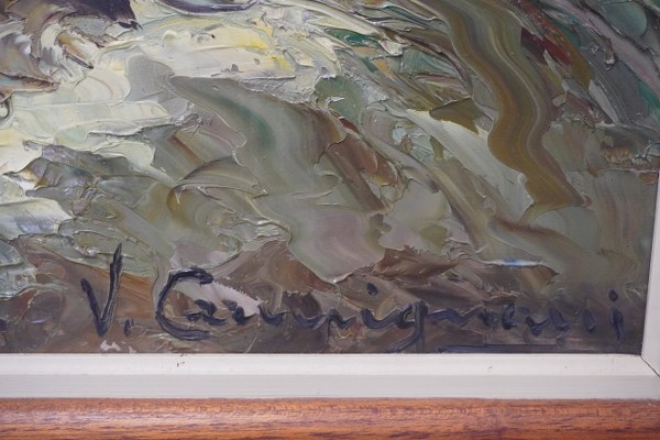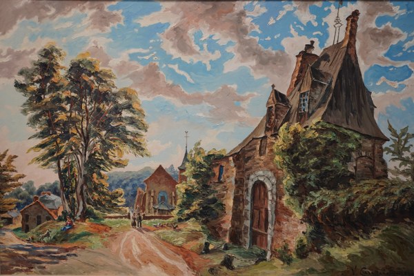 Huile sur panneau, entrée de village avec vue d'église signé en bas à droite. 112x165cm.