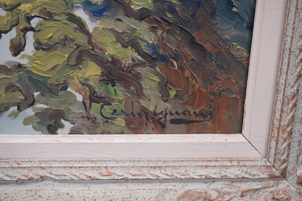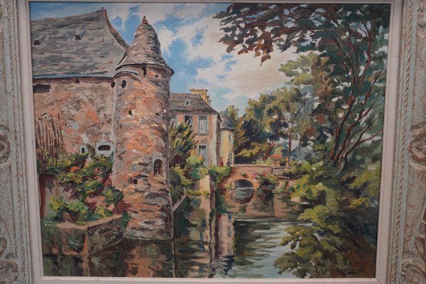 Huile sur panneau, Château en bord de rivière signé en bas à droite dans un encadrement. Château de Vauilly au dos. 83x99cm.