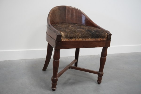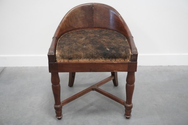 Fauteuil de chantre en acajou mouluré et sculpté. Il repose sur quatre pieds, les deux antérieurs à balustres et les pieds antérieurs sabre réunis par une entretoise en X. Estampillé sous la traverse antérieur P.BELLANGE. 63 x 48,5 x 44 cm. Époque Empire. Assise à recouvrir, une traverse d'entretoise manquante, fentes, accidents. Pierre-Antoine Bellangé (1757-1827) fut reçu maître en 1788. Fabricant pour le garde-meuble impérial puis royal, il passera sous Charles X à la direction général du mobilier de la couronne et nommé ébéniste du roi.