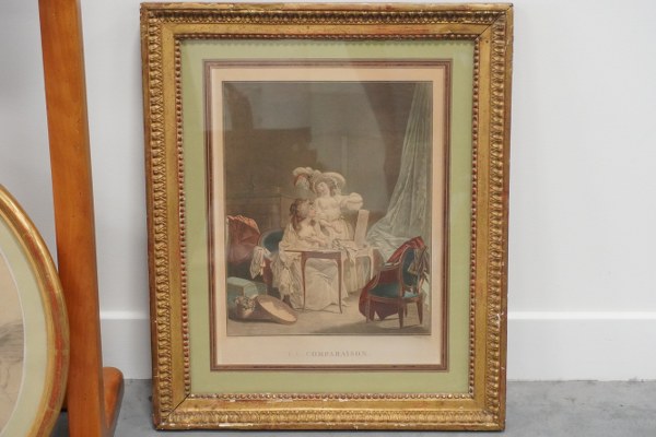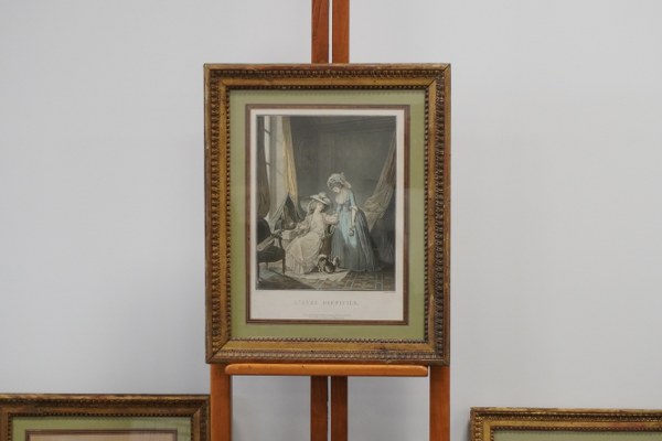 D'après Nicolas LAVRINCE - F. Janinet graveur. L'aveu difficile, l'Indiscrétion et la Comparaison. Suite de 3 gravures encadrées sous verre. Taches. Accidents. Avec cadre : environ 63 x 51,5 cm. On y joint un dessin représentant une jeune femme à la colombe encadrée sous verre dans un cadre à vue ovale. (taches, accidents) Hauteur : environ 50 cm.