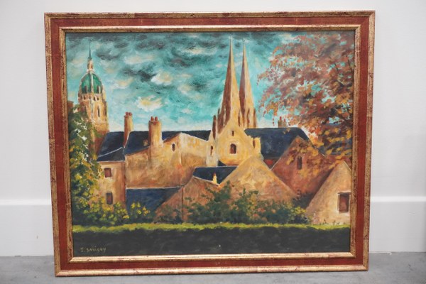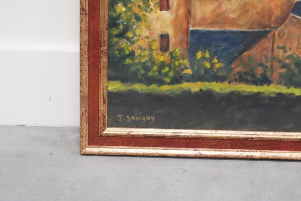 lot de 3 tableaux dont : - Ecole de la fin du XIXe siècle. Vue d'un château. Huile sur toile. Accidents et manques. 35 x 50 cm. - Ecole du XXe siècle. Paysage animé. Huile sur panneau. 14 x 24 cm. - Isabelle Savigny. Bayeux, 2011. Huile sur papier encadrée sous verre. A vue : 39 x 49 cm.