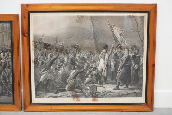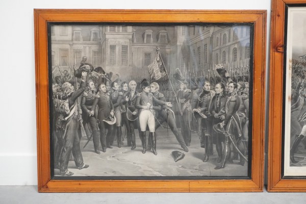 2 gravures encadrées sous verre dont : - D'après Steuben, Retour de l'Ile d'Elbe, gravé par Jazet. Taches, rousseurs. Avec cadre : 64,5 x 79 cm. - D'après Horace Vernet, Adieux de Fontainebleau, gravure. Encadrée sous verre. Accident au verre, taches. Avec cadre : 58 x 72,5 cm.