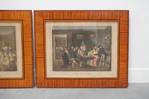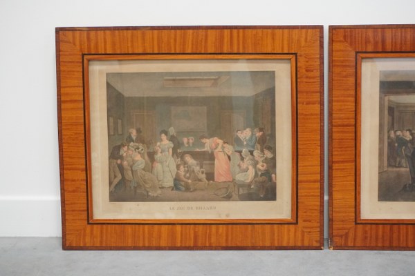 D'après Louis Léopold BOILLY (1761-1845). "Le jeu de l'écarté" et "Le jeu de billard". Deux gravures en couleurs encadrées sous verre. Taches. Avec cadre : 55 x 65 cm.