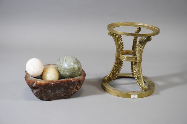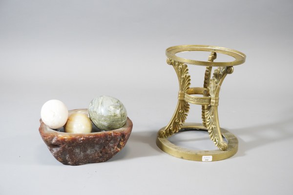 Cendrier et 3 œufs en pierre dure, on y joint une monture en laiton.