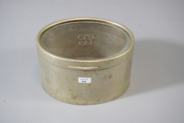 Boite en métal avec couvercle en verre portant des initiales.
