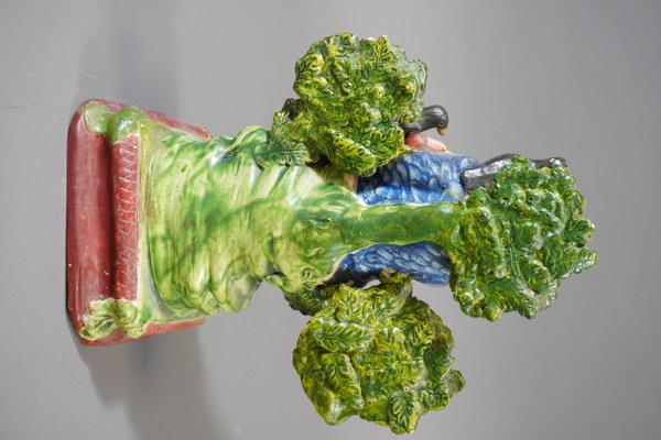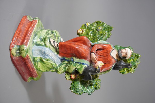 Statuette d'homme en faience à la cape donnant à manger aux oiseaux. Hauteur: 24cm. Petits accidents.