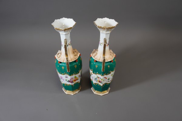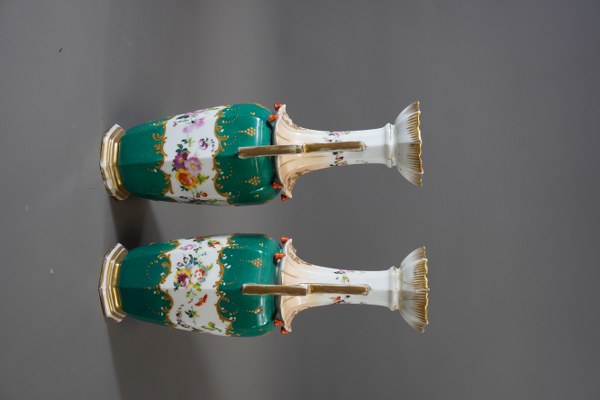 Paire de vases à anses en porcelaine à décor floral et pompons en relief. Accidents et restaurations. Hauteur: 36,5cm.
