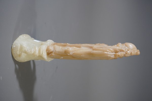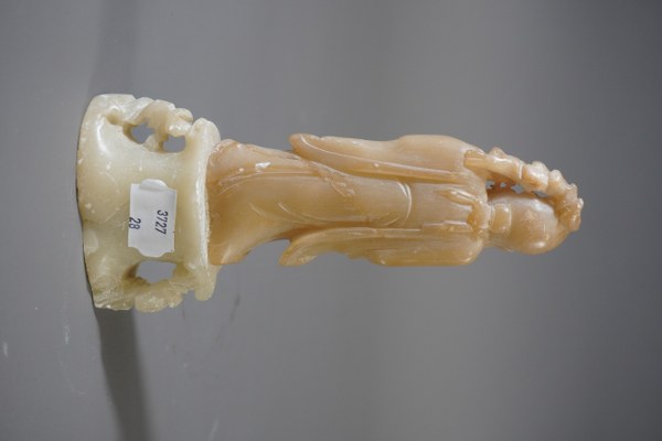 Statuette en pierre dure d'un personnage asiatique. Hauteur: 19cm. Eclats.