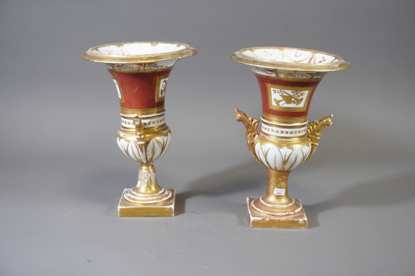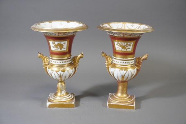 Paire de vases sur piédouche en porcelaine. Hauteur: 26cm. Accidents et restaurations.