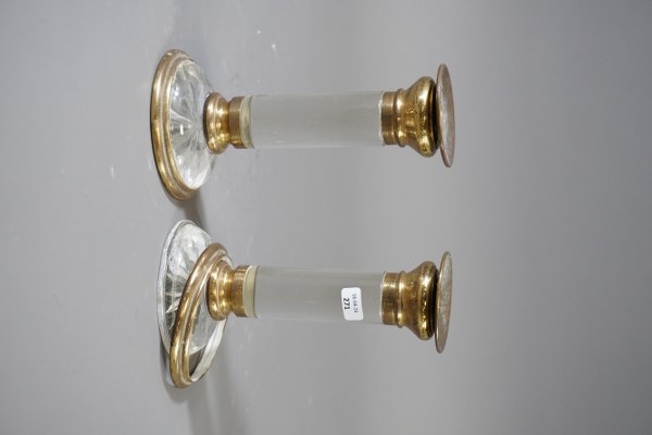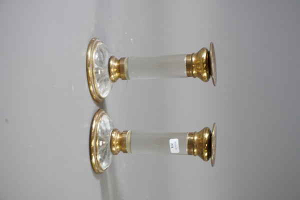 Paire de bougeoirs en verre monture laiton. Hauteur: 14,5cm. Une monture détachée.