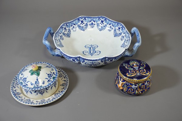 Melonnière en faïence de Gien. 26x34cm. On y joint 2 bonbonnières. Accidents.
