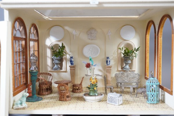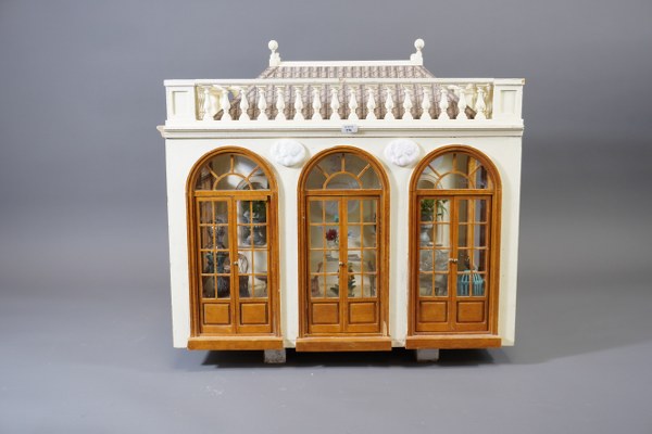 Diorama représentant un salon Napoléon III en miniature, meublé et divers éléments de décorations. 35x41cm. Accidents.