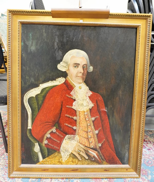 Ecole contemporaine. Homme de qualité. Huile sur toile. Accidents, toile déchirée, restaurations. Encadrement avec éclairage (sans garantie de fonctionnement). 92 x 73 cm.