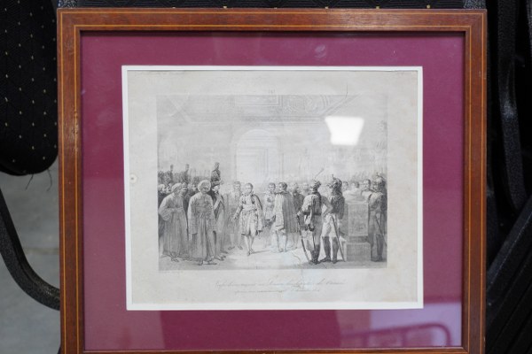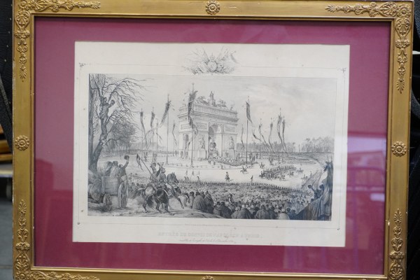 Deux estampes encadrées sous verre comprenant : - D'après Victor Adam et Bichebois, Entrée du convoi de Napoléon à Paris - D'après Arnont et Adam, Réception du corps de Napoléon à l'Hôtel des Invalides Rousseurs et taches. Avec cadres : 44 x 59 cm. On y joint 2 estampes encadrées sous verre : Napoléon reçoit au Louvre les députés de l'armée et La gamelle des braves vaut la table des rois. (déchirure sur l'une, taches).