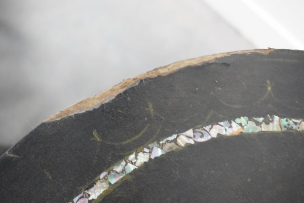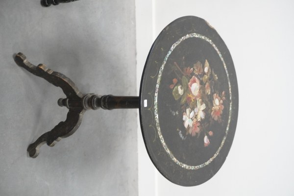 Guéridon Napoléon III avec incrustation de nacre et 1 chaise en bois noirci peinte.