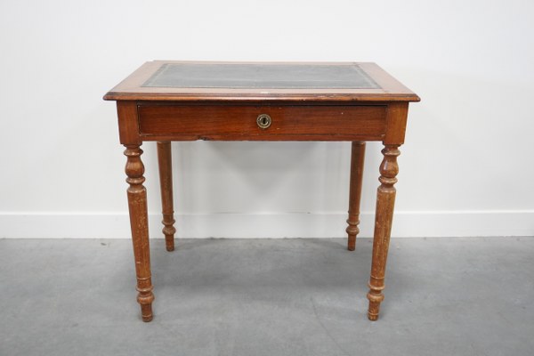 Table bureau ouvrant à 1 tiroir en ceinture en bois naturel et dessus de cuir. Accidents 70x80x55cm.