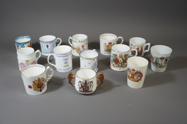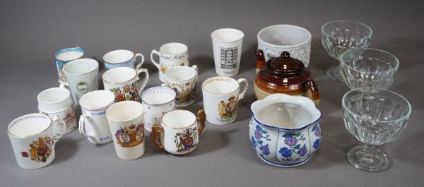 3 Coupes sur pied, 2 caches pots et 1 lot de tasses d'anniversaire sur le royaume d'Angleterre. Accidents.