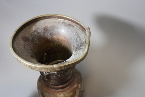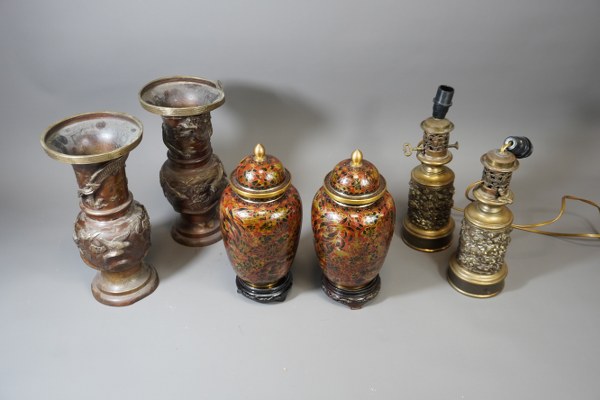 Lot de 2 paires de vases, une paire en bronze accidentés hauteur: 30cm et l'autre paire en pot couvert à décor floral hauteur: 25cm. On y joint une paire de lampes à pétrole montées électrique en laiton repoussé.