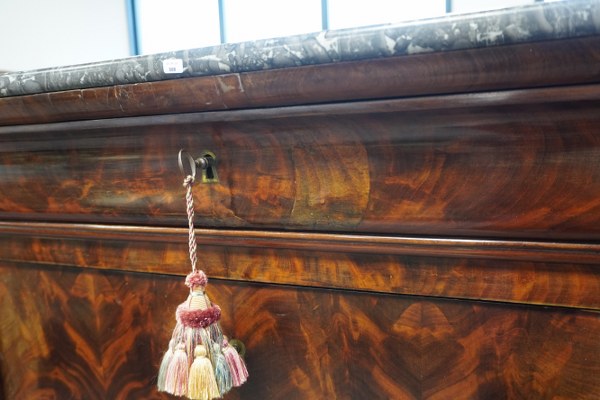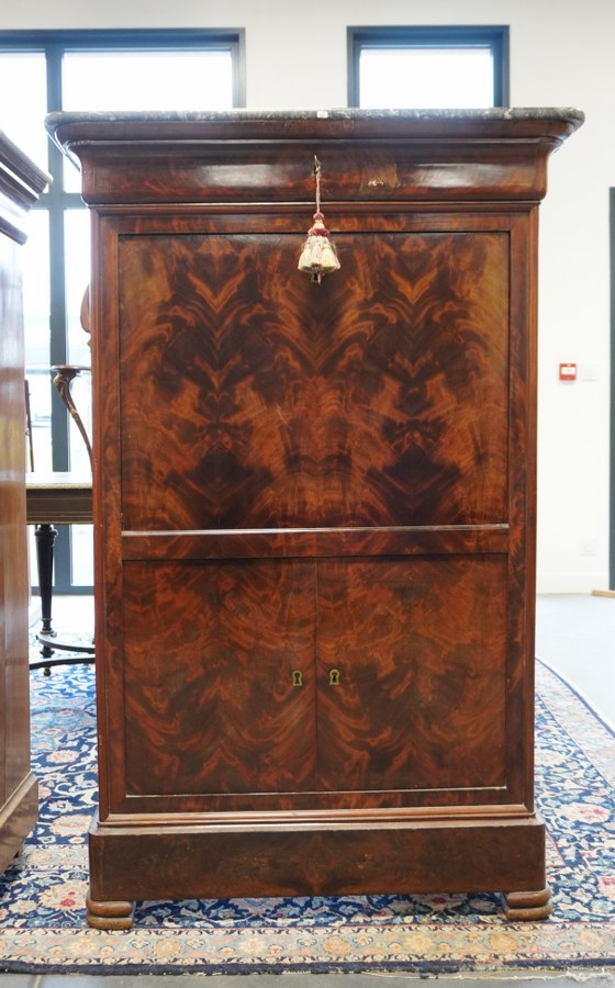 Secrétaire dessus de marbre gris, ouvrant à 1 tiroir, 1 abattant et double portes. 149x97x43cm.