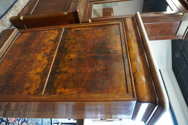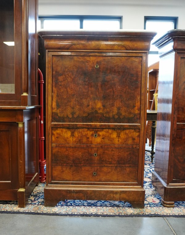 Secrétaire dessus de marbre blanc ouvrant à 4 tiroirs et 1 abattant. Sans clé. 148x97x42cm.