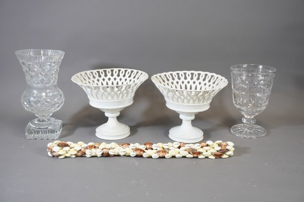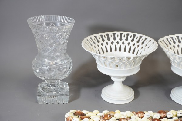 Paire de coupes en porcelaine ajourées, on y joint 2 vases en cristal. Accidents.