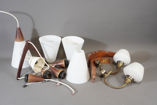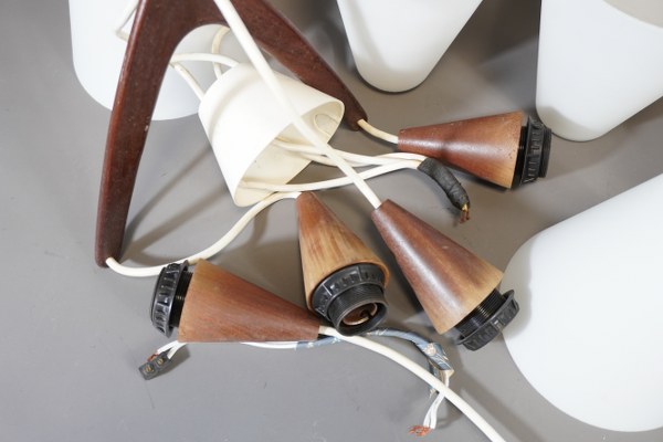 Dans le gout de Louis Christian Kalff, suspension Boomerang à trois bras de lumière en teck et opaline. On y joint une paire d'appliques en laiton.
