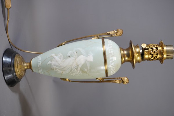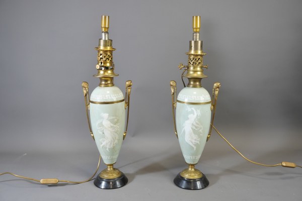 Paire de lampes à pétrole électrifiées monture en bronze doré et fut en porcelaine à décor de femme. Accidents et restaurations. Hauteur: 61cm.