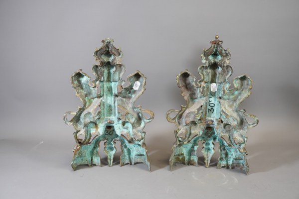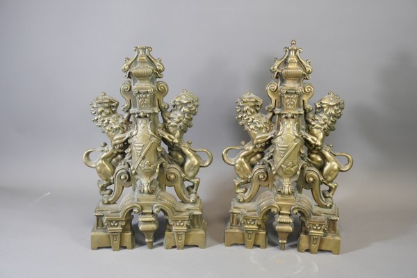 Paire de devanture de chenets en bronze doré à décor de lions et de blason en son centre. Hauteur: 53cm.