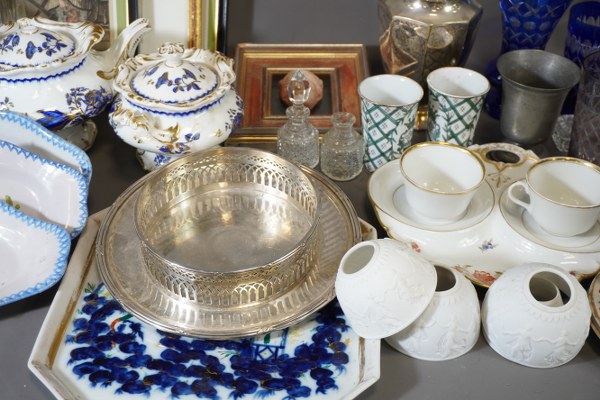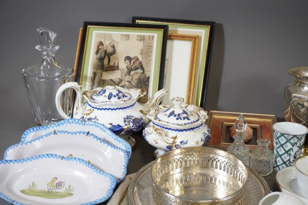 Lot de vaisselles, bibelots, statuettes, étain, cadres, verreries, service et divers.... dans 3 cartons dans l'état.